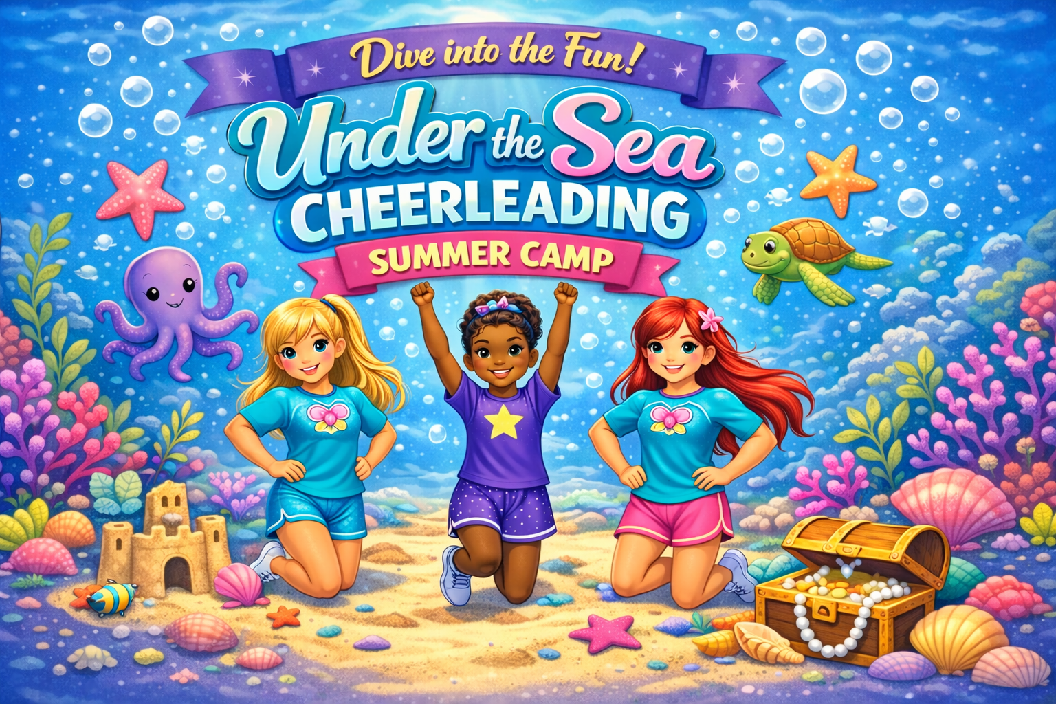Get ready to make waves this summer at our Under the Sea Cheerleading Summer Day Camp—a high-energy, confidence-building camp designed for cheerleaders of all levels! Campers will explore the fundamentals of cheerleading while enjoying a magical ocean-themed experience filled with teamwork, creativity, and tons of fun. Throughout the week, cheerleaders will learn cheers, chants, jumps,...