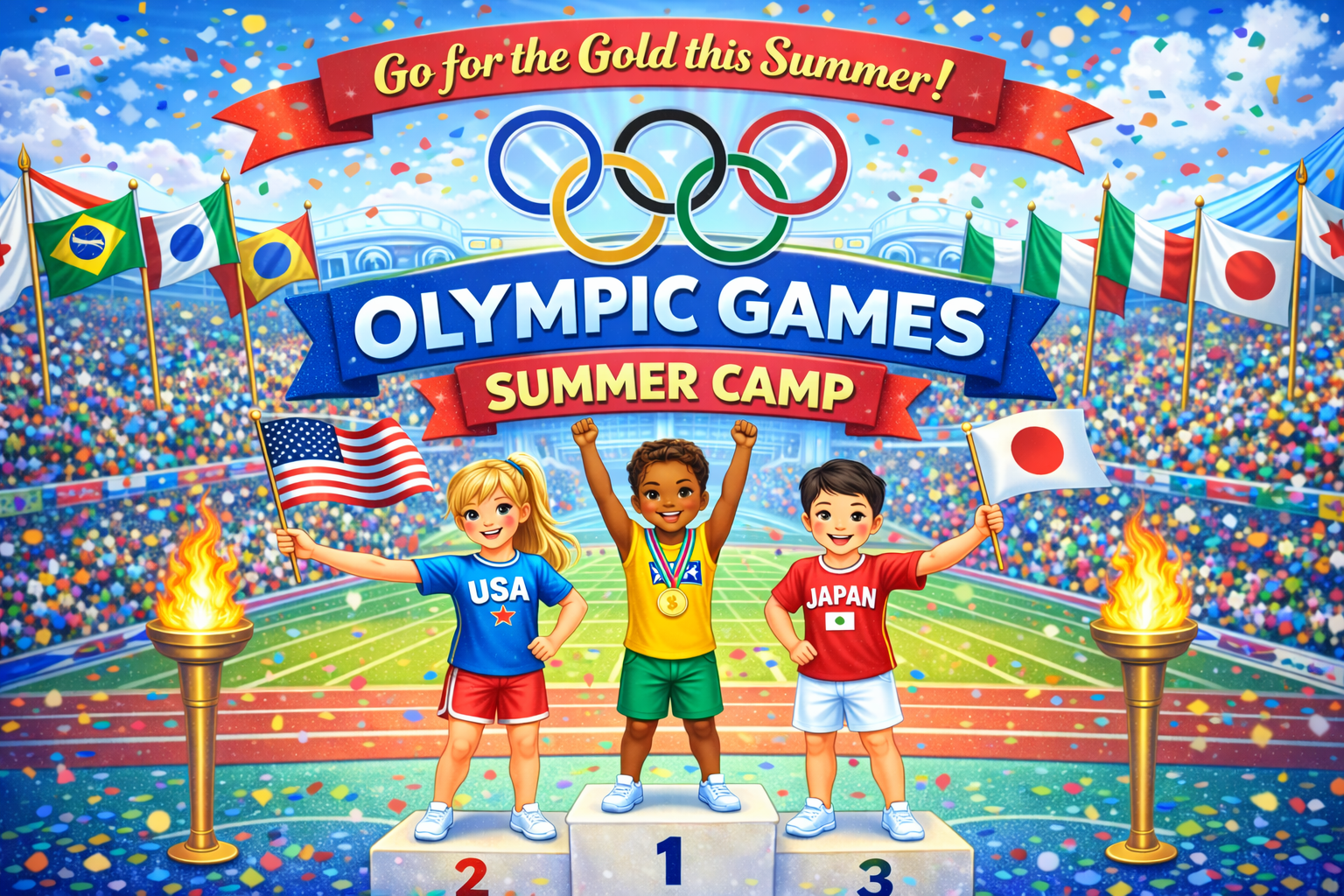 Get ready to train, compete, and celebrate like an Olympian at our Olympic Games–Themed Summer Camp! This action-packed camp is designed to inspire campers through movement, teamwork, and fun while introducing them to a wide variety of sports and games inspired by the Olympic Games.Throughout the week, campers will be divided into teams representing different...